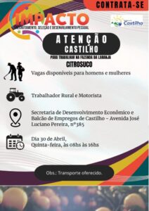O Balcão de Empregos da Secretaria Municipal de Desenvolvimento Econômico e Trabalho da Prefeitura de Castilho, anunciou hoje a abertura de novas vagas de trabalho
