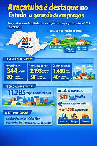 Araçatuba é uma das cidades que mais geraram empregos formais em 2025 no Estado, figurando no 20º lugar entre os 50 municípios paulistas com melhor desempenho na criação de vagas. A informação consta em reportagem divulgada pela Agência de Notícias do Governo do Estado, baseada em dados da Fundação Seade e no Cadastro Geral de Empregados e Desempregados (Caged), órgão do Ministério do Trabalho e Emprego.