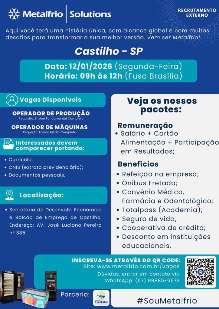 As vagas são para Operador de Produção (Ensino Fundamental Completo) e Operador de Máquinas (Ensino Médio Completo) e os interessados nestas funções devem ir até o Balcão de Empregos da Prefeitura de Castilho, localizado na Avenida José Luciano Pereira nº 385 (ao lado da Caixa d’Água Central), no período compreendido entre as 09h e as 12h da manhã, levando consigo: currículo profissional atualizado, documentos pessoais e o extrato previdenciário (CNIS).