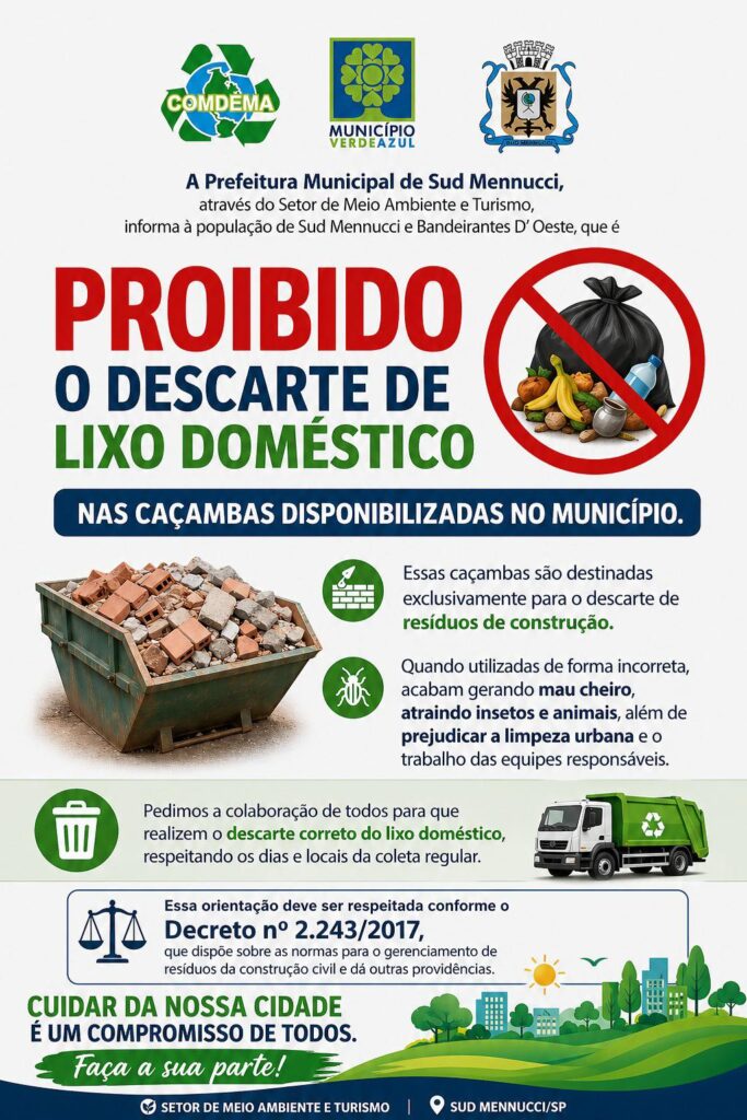 O Setor de Meio Ambiente e Turismo da Prefeitura de Sud Mennucci lançou um alerta importante para os moradores da sede e do distrito de Bandeirantes D’Oeste: as caçambas espalhadas pela cidade têm uso exclusivo e não devem receber lixo doméstico.