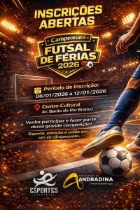 O governo de Andradina, por meio da Secretaria de Turismo, Esporte, Lazer e Juventude, abriu oficialmente as inscrições para o Campeonato Futsal de Férias 2026.