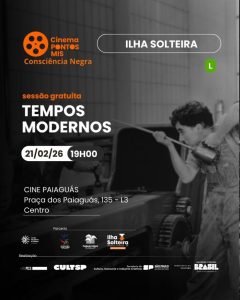 Neste sábado, 21 de fevereiro, a partir das 19 horas, o Cine Paiaguás exibe o filme “Tempos Modernos”, com entrada gratuita e classificação livre. Trata-se