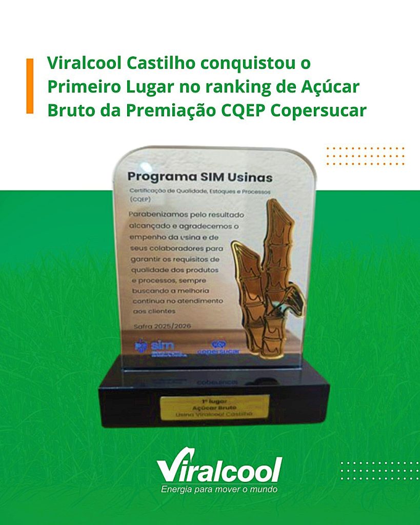 A busca pela pureza e eficiência acaba de render um troféu de peso para Castilho. A Usina Viralcool celebrou nesta semana a conquista do 1º lugar no ranking de Açúcar Bruto da Premiação CQEP, um braço estratégico do Programa SIM (Sistema de Inteligência de Manutenção e Operação) da Copersucar, que é basicamente a “Champions League” da eficiência técnica entre as usinas cooperadas.