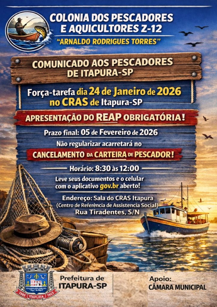 De acordo com a Colonia dos Pescadores e Aquicultores Z-12, de Santa Fé do Sul, no último dia 07 de janeiro, o Governo Federal anunciou que os pescadores têm até o dia 05 de fevereiro para apresentarem os REAP – Relatórios de Atividades Pesqueira solicitados pelo MPA – Ministério da Pesca e Aquicultura.