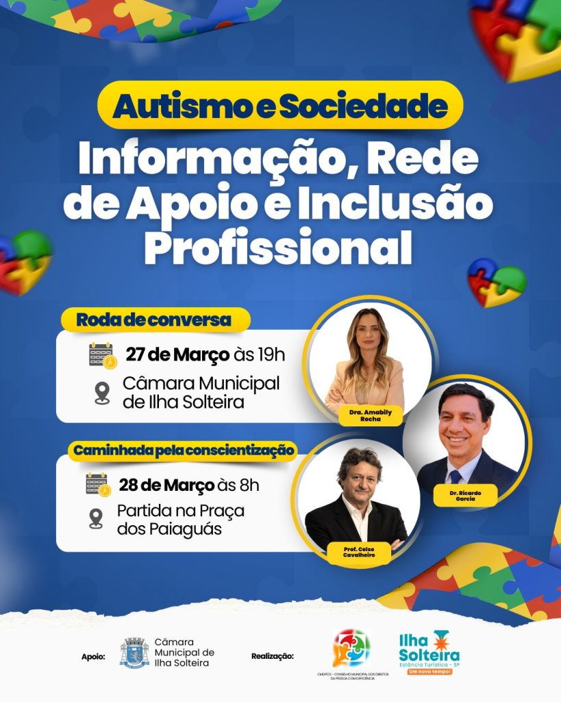 Na noite de quinta-feira, 27 de março, a Câmara Municipal sediará uma Roda de Conversa a partir das 19h. O painel contará com a presença da Dra. Amabily Rocha, do Dr. Ricardo Garcia e do Professor Celso Cavalheiro. Em pauta, temas fundamentais como a importância do diagnóstico precoce, os desafios da inclusão social e as estratégias para a inserção de autistas no mercado de trabalho.