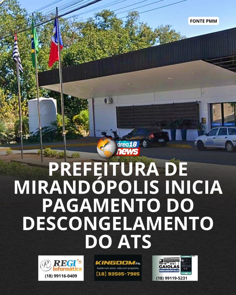 O Portal de Notícias “Área 18 News” anunciou nesta segunda-feira que a Prefeitura de Mirandópolis iniciará, a partir do pagamento previsto para sexta-feira (06/02), o descongelamento do Adicional por Tempo de Serviço (ATS) dos servidores municipais, conforme a Lei Complementar nº 226/2026, a chamada Lei do Descongela.
