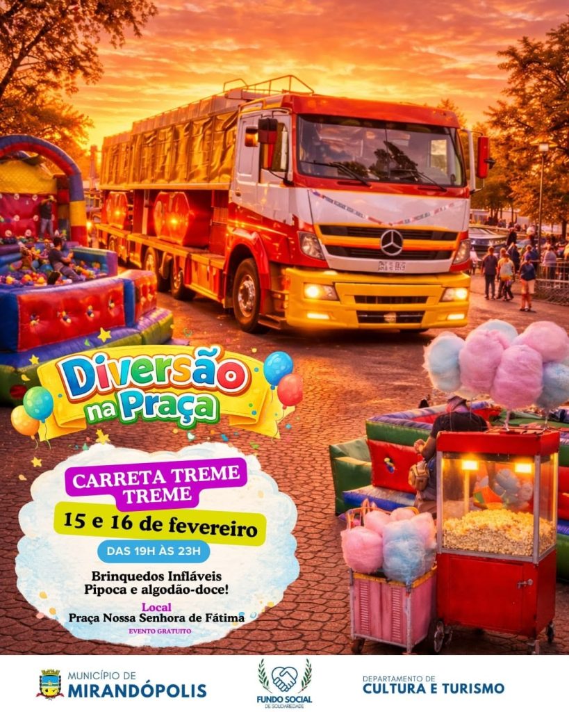 O Município de Mirandópolis realiza, nos dias 15 e 16 de fevereiro, o evento “Diversão na Praça”, na Praça Nossa Senhora de Fátima, com programação gratuita voltada ao lazer da população, em razão das festividades de Carnaval.