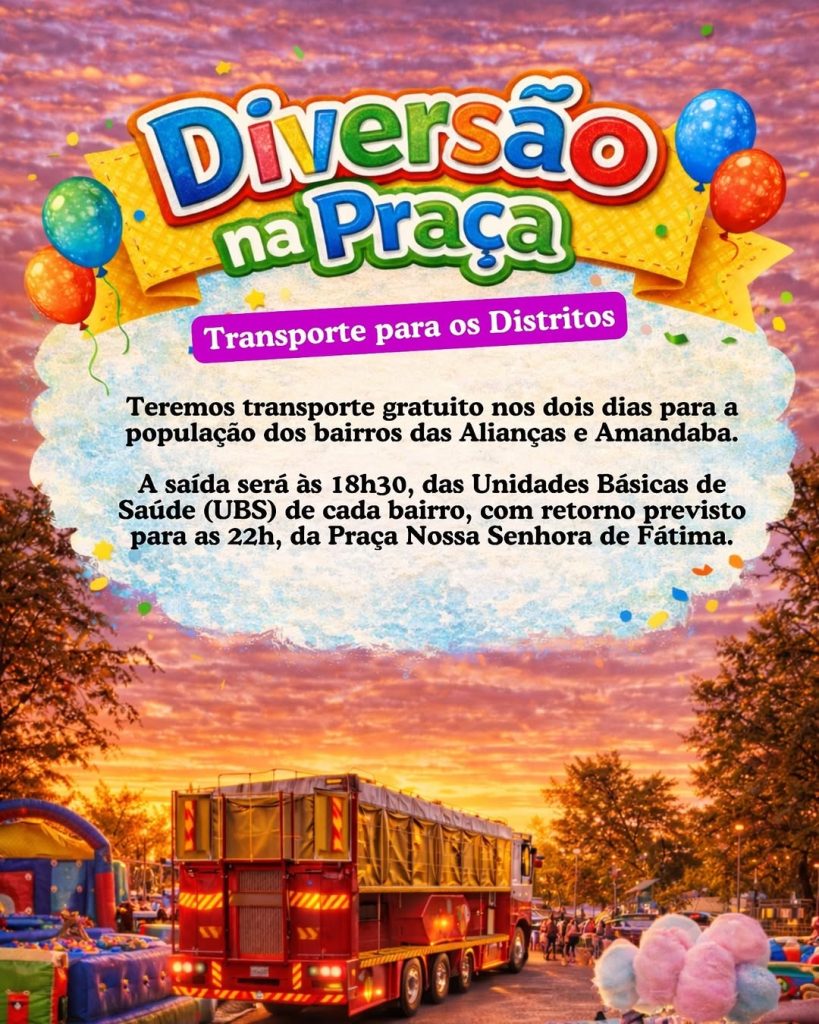 Para ampliar o acesso ao evento, o Município disponibilizará transporte gratuito para os moradores dos distritos de Alianças e Amandaba, nos dois dias de programação. A saída ocorrerá às 18h30, a partir das Unidades Básicas de Saúde (UBS) de cada bairro, com retorno previsto para as 22h, saindo da Praça Nossa Senhora de Fátima.