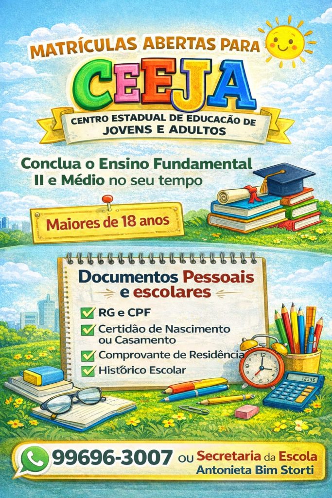 Se você tem 18 anos ou mais e interrompeu os estudos por qualquer motivo, chegou a hora de retomar o aprendizado e finalizar o Ensino Fundamental II (6º ao 9º ano) e Médio. Para lhe ajudar nessa tarefa, a Secretaria de Educação de Murutinga do Sul anunciou a abertura das matrículas gratuitas para o CEEJA – Centro Estadual de Educação de Jovens e Adultos.