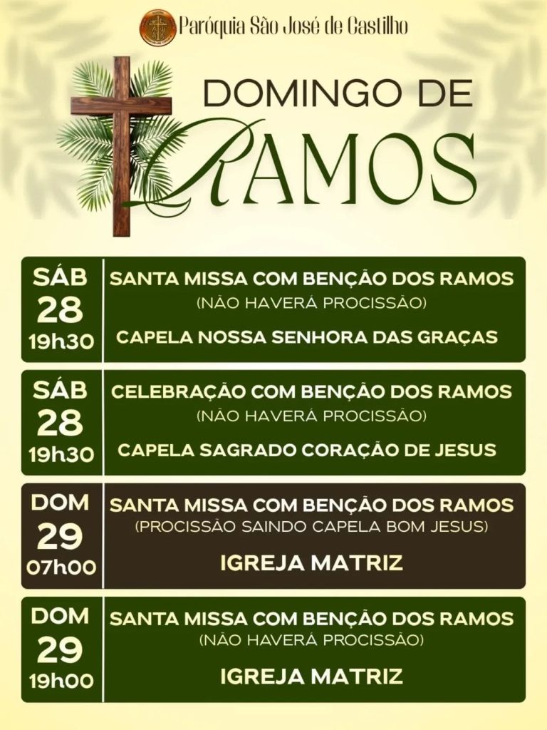 A comunidade católica de Castilho inicia neste final de semana, as celebrações da Semana Santa com a tradicional liturgia do Domingo de Ramos. A data recorda a entrada messiânica de Jesus em Jerusalém e marca o início do período mais importante do calendário litúrgico cristão, que culmina na Páscoa.