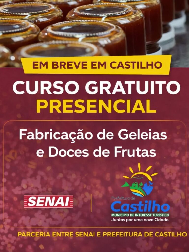 A Prefeitura de Castilho, em uma parceria estratégica com o SENAI, anunciou a abertura das inscrições para o novo curso presencial de Fabricação de Geleias e Doces de Frutas. A formação é totalmente gratuita e visa oferecer aos cidadãos uma nova qualificação profissional e a possibilidade de empreender no ramo alimentício.