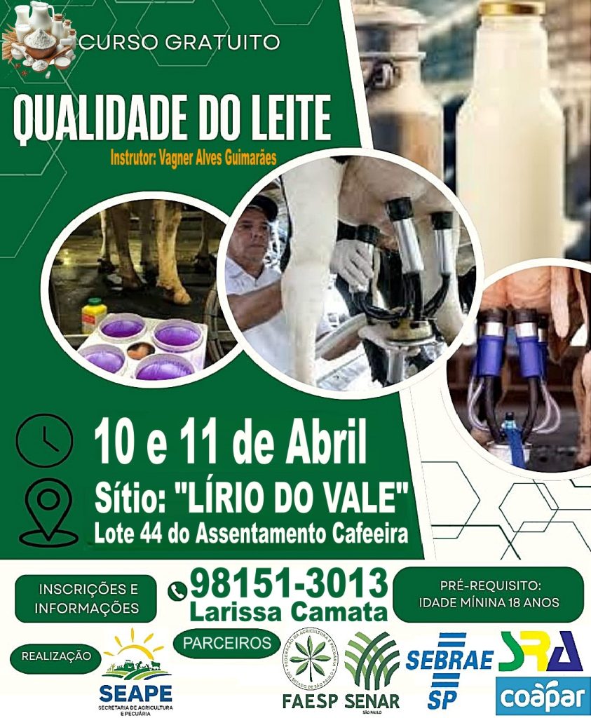 A Secretaria de Agricultura e Pecuária de Castilho (SEAPE) já abriu as inscrições para mais uma capacitação gratuita voltada aos empreendedores rurais do município. As vagas são para maiores de 18 anos interessados em conhecer a fundo os segredos da produção e QUALIDADE DO LEITE.