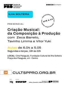Ilha Solteira terá curso inédito, gratuito e completo de CRIAÇÃO MUSICAL Estão abertas as inscrições para o curso “Criação Musical: Da Composição à Produção”, que será realizado presencialmente no Cine Paiaguás. A formação oferece 20 vagas Leia mais » fevereiro 26, 2026